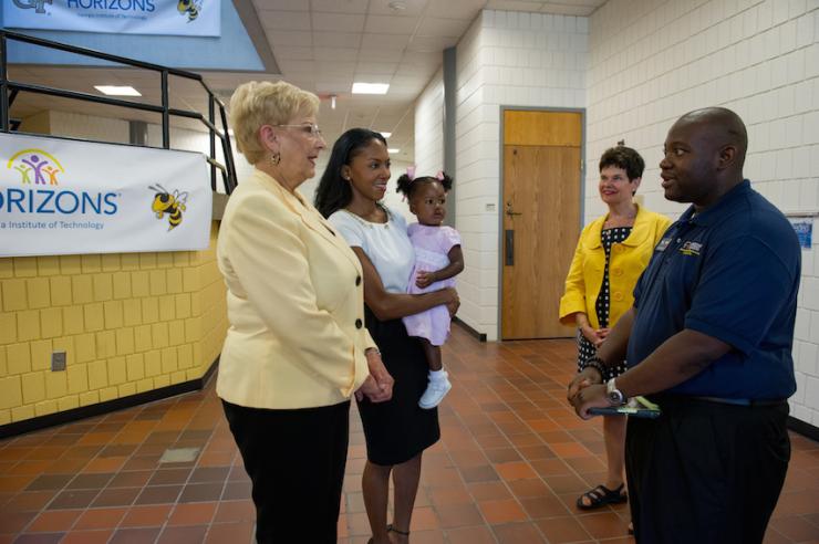 Horizons Site Director, Sirocus Barnes and Georgia Tech First Lady, Val Peterson greeting Mystery Readers Sarah Elizabeth Reed, First Lady of Atlanta and Sandra Deal, First Lady of Georgia.