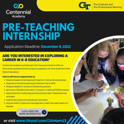 The Pre-Teaching Spring 2023 internship at Centennial Academy, a K-8 conversion charter school in Atlanta Public Schools, will support the implementation of Project-Based Learning (PBL) in a STEAM (Science, Technology, Engineering, Arts, and Mathematics) environment. The intern will support Accelerated Pathway Teachers in various grade levels as well as the STEAM Specialist and Gifted Coordinator. The emphasis of the experience will be on meeting the needs of a wide spectrum of learners particularly those identified as high-achieving learners. Research has shown that oftentimes accelerated scholars are one of the most underserved populations within schools. With the Accelerated Pathway, scholars receive rigorous instruction using above grade-level standards in Mathematics and Science. The Accelerated Pathway Program is further enhanced through daily integration of rigorous Project-Based Learning (PBL) Units.