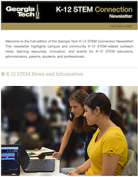 The Georgia Tech K-12 Connection provides a method of searching for K-12 STEM & STEAM programs that are hosted by the various schools and departments on the Georgia Tech campus. Requests for help with K-12 STEM events and projects are available for teachers, school administrators, and superintendents. This includes Georgia Tech staff and faculty.