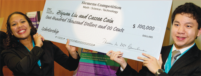 The Siemens Competition, administered by Discovery Education, awards a $1000 scholarship to each regional finalist, in addition to one $3,000 prize to an individual winner and a $6,000 prize to a team winner at each regional competition. Winners of the regional events will advance to the National Finals at The George Washington University in Washington, D.C., where $500,000 in scholarships will be awarded, including two top prizes of $100,000.