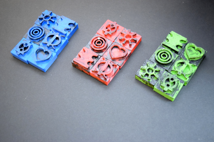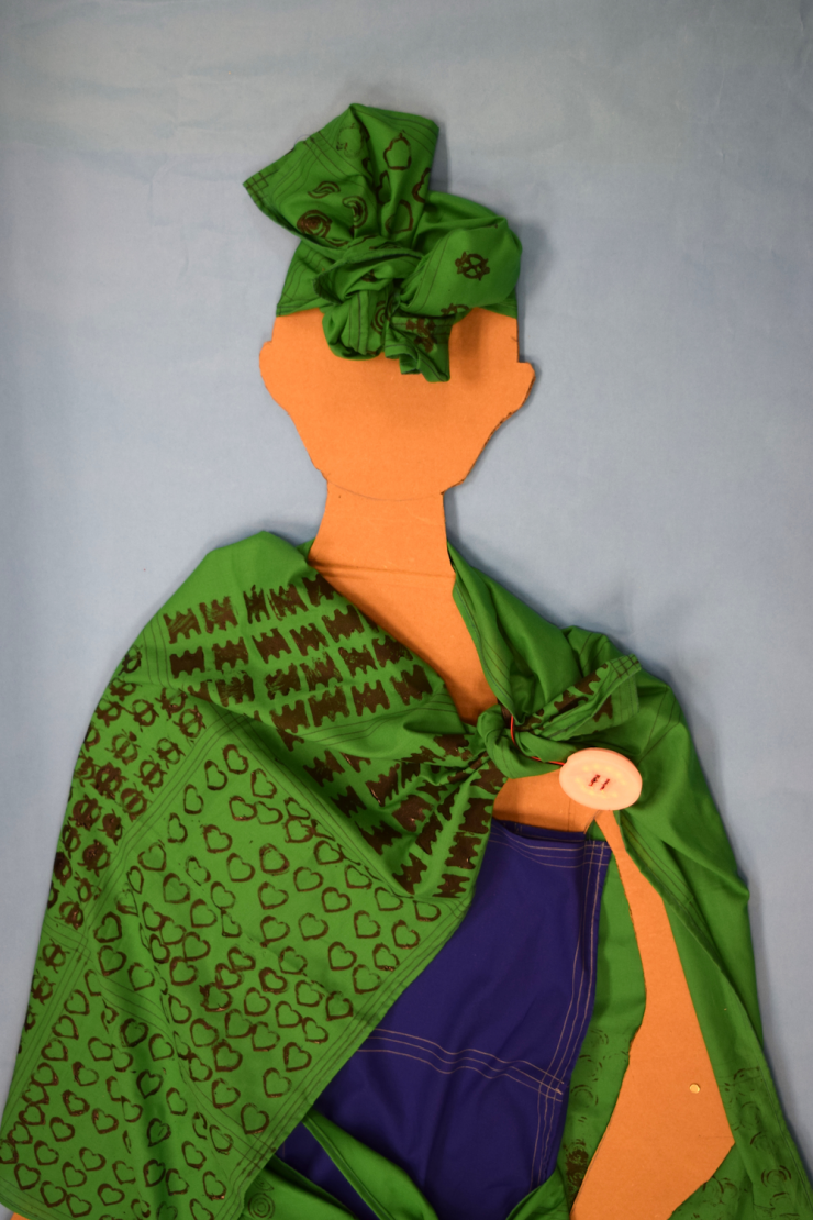 In art class, the students used 3D-printed Adinkra stamps to transfer the symbols onto cloth panels. The panels were fashioned into costumes that incorporate brooches, which the students programmed to light up.